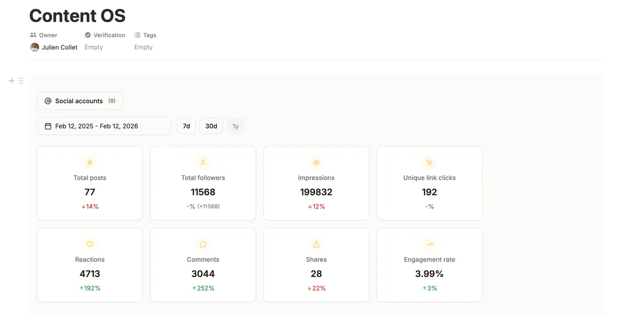 Manage multiple clients' social accounts and track performance from Notion.