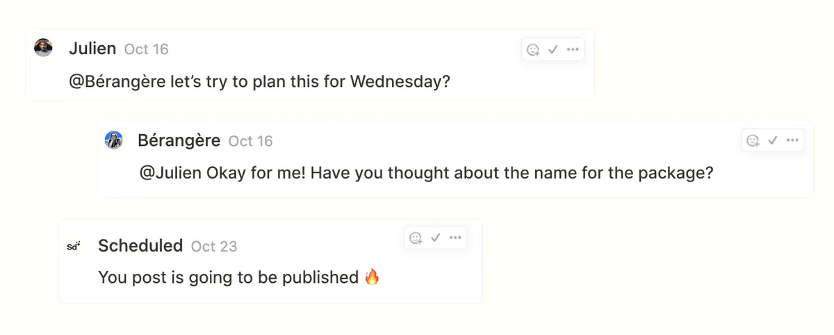 "This moment...🤩🤩🤩 I manage LinkedIn profiles and pages since 2012 (and CEO's strategist since 2015) I saw a lot of tools to schedule my content on LinkedIn... Buffer, Hootsuite, Hubspot... Each time I had the same conclusion: it's better to publish myself! The only reason: you can't mention other LinkedIn pages in your posts. But now, I can! And other revolution, from my Notion, I can schedule posts for my client's LinkedIn profile. Thanks Julien and Scheduled."