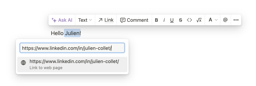 Tag any LinkedIn profile or page from Notion by writing the name and adding a hyperlink to the LinkedIn URL.
