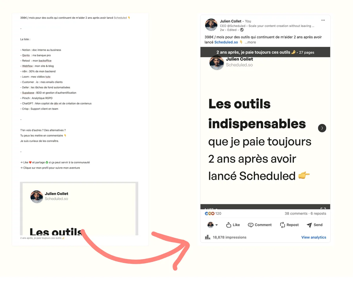 "Before I was using a tool to schedule my posts and it was costing me around 100e/month. The tool was powerful but too advanced for me. Now, I can publish my LinkedIn posts directly from my Notion, I use one less tool, it's 10 time cheaper and I can post on all LinkedIn pages I have. What else?"