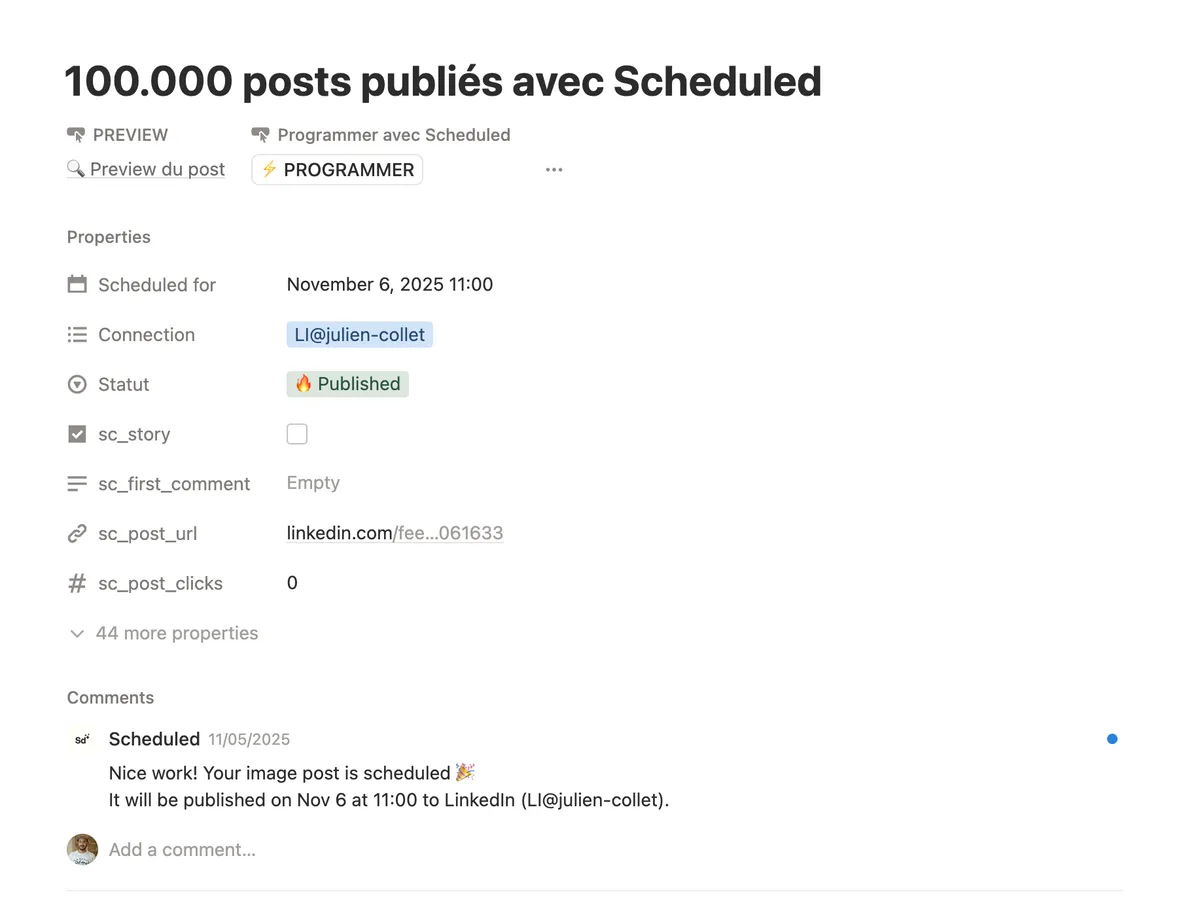 "This moment...🤩🤩🤩 I manage LinkedIn profiles and pages since 2012 (and CEO's strategist since 2015) I saw a lot of tools to schedule my content on LinkedIn... Buffer, Hootsuite, Hubspot... Each time I had the same conclusion: it's better to publish myself! The only reason: you can't mention other LinkedIn pages in your posts. But now, I can! And other revolution, from my Notion, I can schedule posts for my client's LinkedIn profile. Thanks Julien and Scheduled."