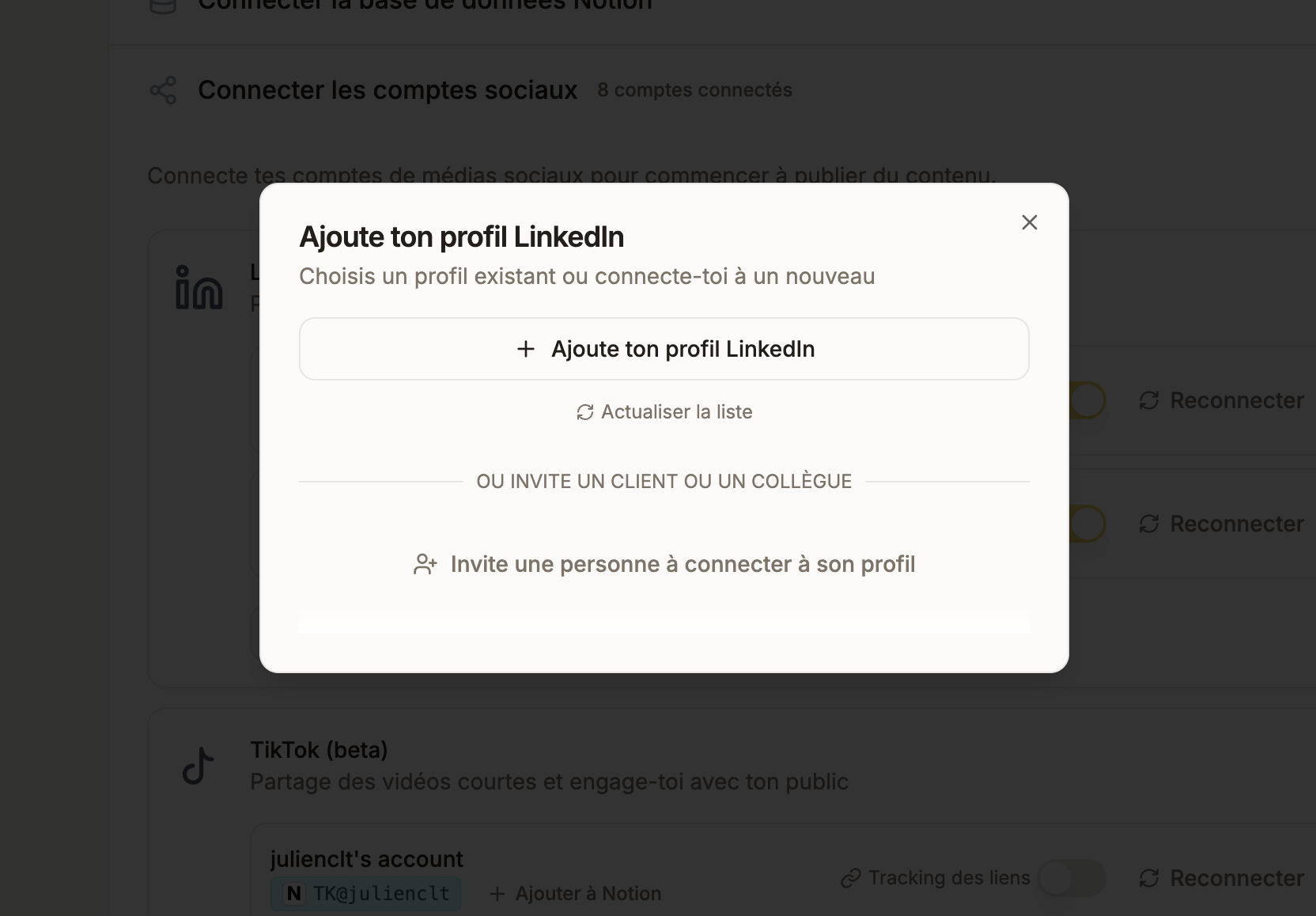 Invite tes clients sur Scheduled et publie sur leurs profils LinkedIn, Instagram, X, Facebook, YouTube et TikTok directement depuis Notion. Ajoute un nombre illimité de comptes clients pour le même prix.