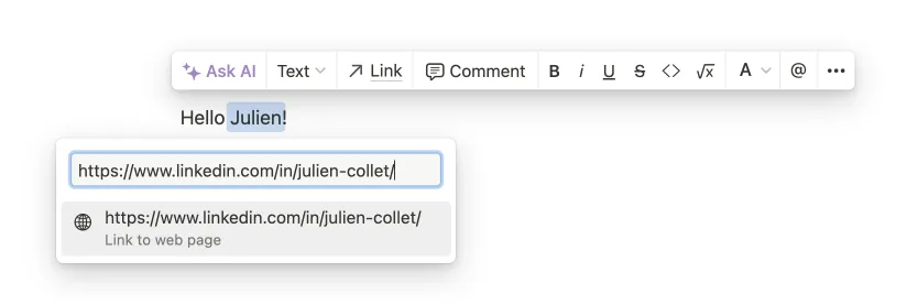 Tag any LinkedIn profile or page from Notion by writing the name and adding a hyperlink to the LinkedIn URL.